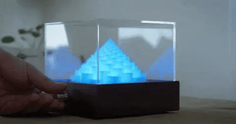 A rotary knob on the front allows the user to change strobe frequency and alter the visual effect. At certain "coherence frequencies," the shapes on the sculpture appear to animate downwards (or upwards). LED color and brightness are also selectable via the knob. The result is an interactive, gorgeous, desktop art piece unlike anything else.