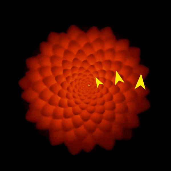 When perfectly tuned, the flashes light up the rotating sculpture at the exact right time to create an illusion in a fashion similar to stop-motion animation. See how the highlighted petal progresses outward in this gif.